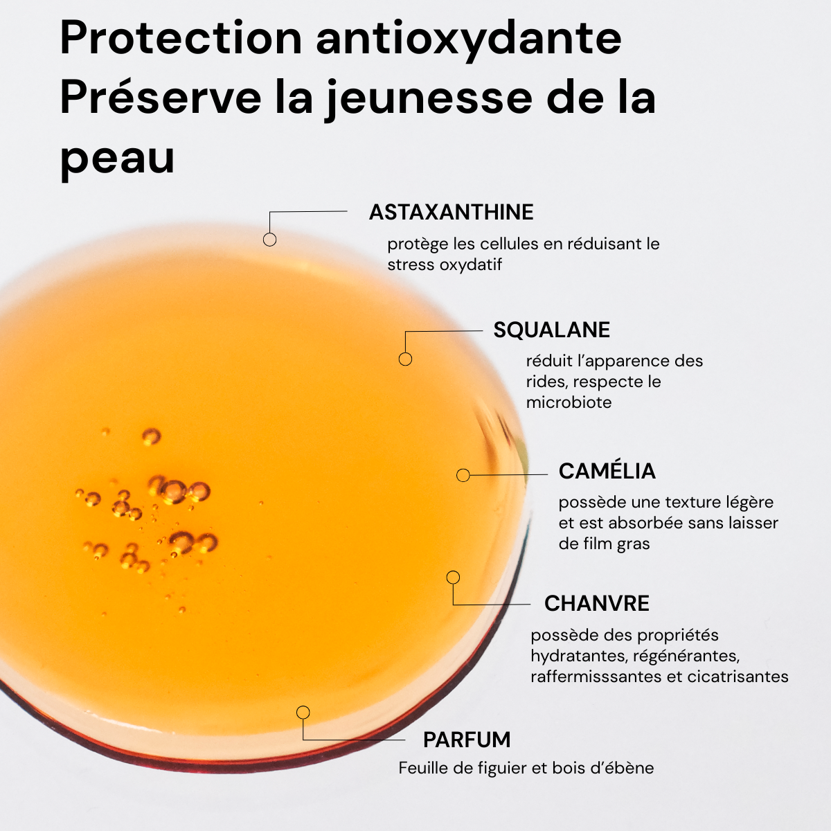 Enriched with astaxanthin, a powerful antioxidant 6,000 times more potent than vitamin C, this oil protects the skin from oxidative stress and neutralizes free radicals responsible for premature aging. Its action helps to even out skin tone, improve radiance, and reduce the appearance of dark spots.